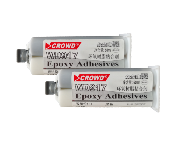 WD917环氧胶粘剂是一种黑色的常温快速固化环氧胶粘剂,该产品为双组份1︰1(体积比),具有6--8min的操作时间和15min表面初步固化的特点,适用于需要快速定位粘接的场合,对各类金属、塑料、玻璃钢、瓷器、木材等具有很强的粘接强度且韧性好,该产品粘度适中、使用操作方便,广泛应用电子工业领域产品粘接封装填充密封防水。可用于流水生产线,能够大幅度提高生产效率。