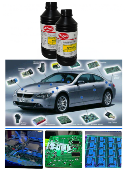 crowd三防漆UV501是一种单组份改性丙烯酸酯树脂合成UV涂覆胶,单组份100%固含量,具有UV紫外光固化和湿气固化双重固化,UV光照能照到的地方快速固化,针对复杂电子线路板中紫外光照射不到的阴影区可通过发生湿气固化,应用于电路板器件及其相关设备免受环境侵入受到损害的保护。是一种特殊配方的涂料形成一层保护膜,用于元器件电路板及其相关设备免受环境的侵蚀,并为各种电子电路系统提供良好的保护作用延长寿命。具有宽广的耐温范围-50~145℃。具有“三防”性能出色,优异的绝缘防潮、防尘和耐冷热冲击、耐化学、耐辐射、耐盐雾、耐臭氧腐蚀、耐振动、防老化、等性能以及柔韧性好附着力强。本产品UV501无溶剂型针对施工环境环保无VOC挥发物。含荧光方便施工检查,符合欧盟环保要求。
