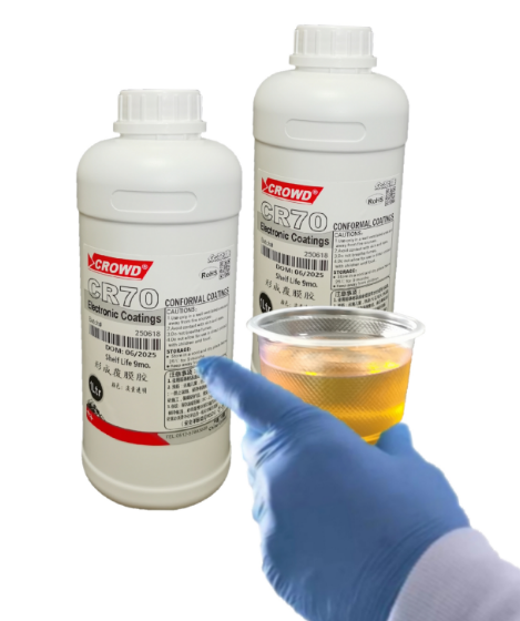 CR70敷形涂料∶单组分、淡黄透明、低等粘度敷形膜胶,固化后透明含荧光的、柔性光泽度的表面。