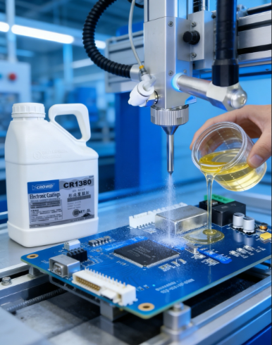CR1380敷形涂料∶单组分、微黄透明、低等粘度敷形涂料,固化后具有坚韧的、耐磨损的表面。
